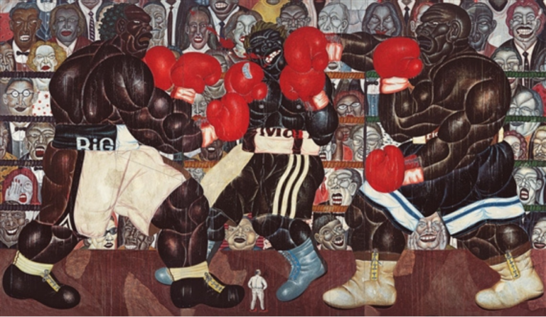 I Nyoman Masriadi is widely recognized for his distinctive figurative paintings that combine humor, satire, and critical commentary on contemporary society. His works often depict muscular, dark-toned figures placed in narrative-driven scenes that reflect human behavior, cultural tension, and social dynamics.